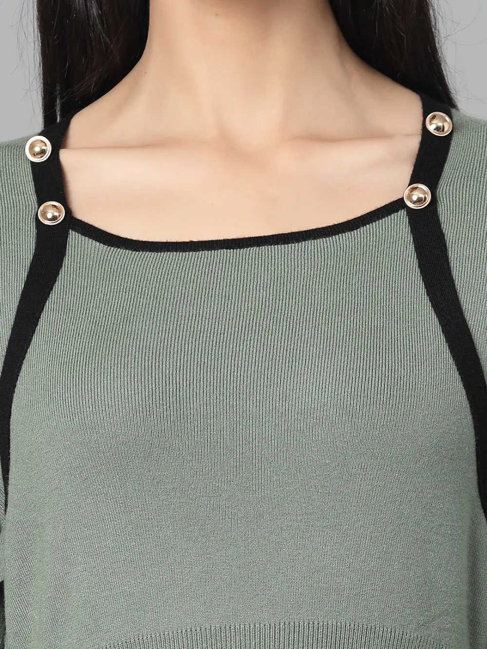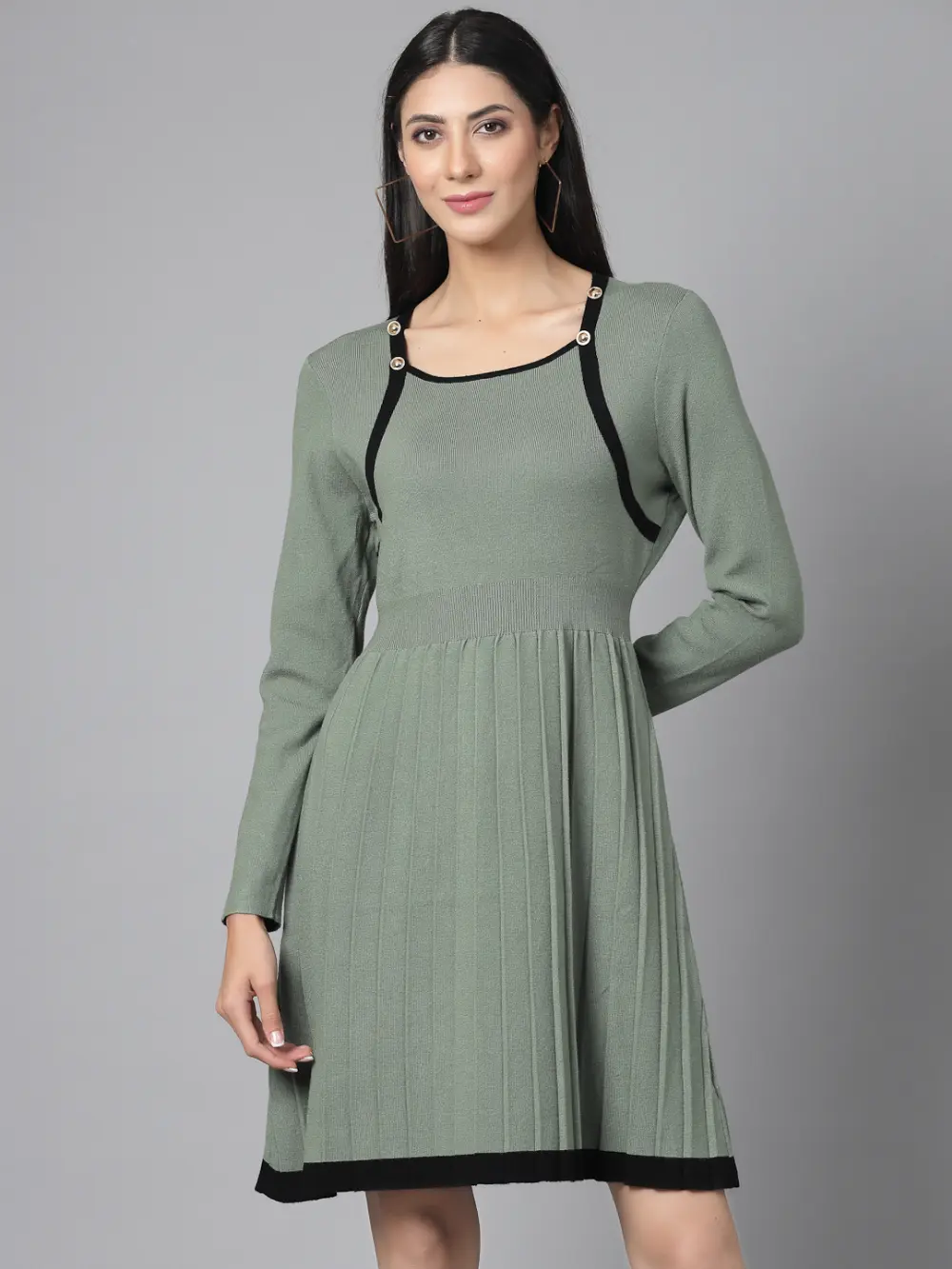 Chic green skater dress featuring a pleated skirt, long sleeves, and button-accented straps. A stylish pick for casual outings or day events.
