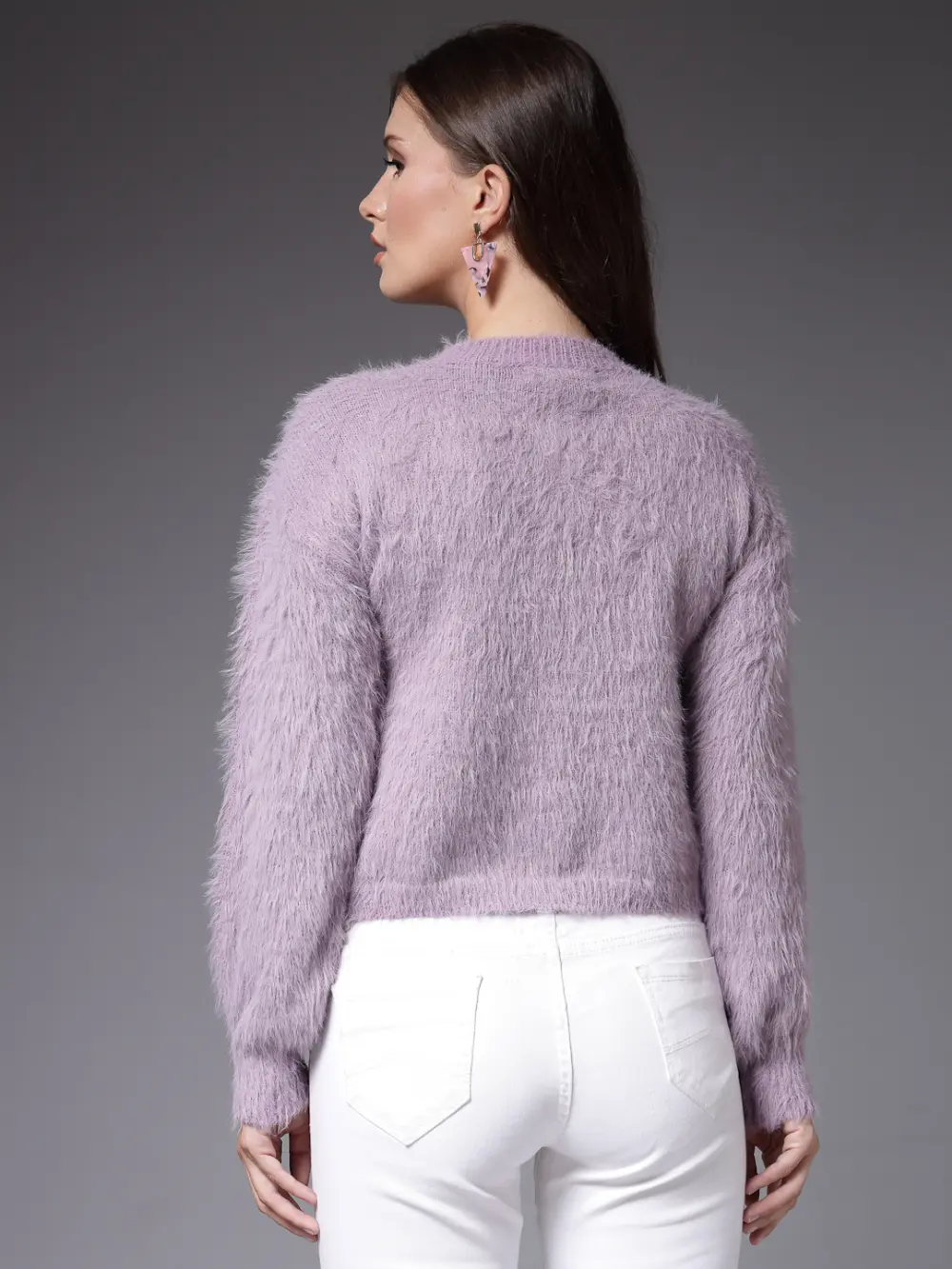 Purple solid embellished detail cropped pullover sweaters, has round neck, long, regular sleeves ribbed hem knitted
