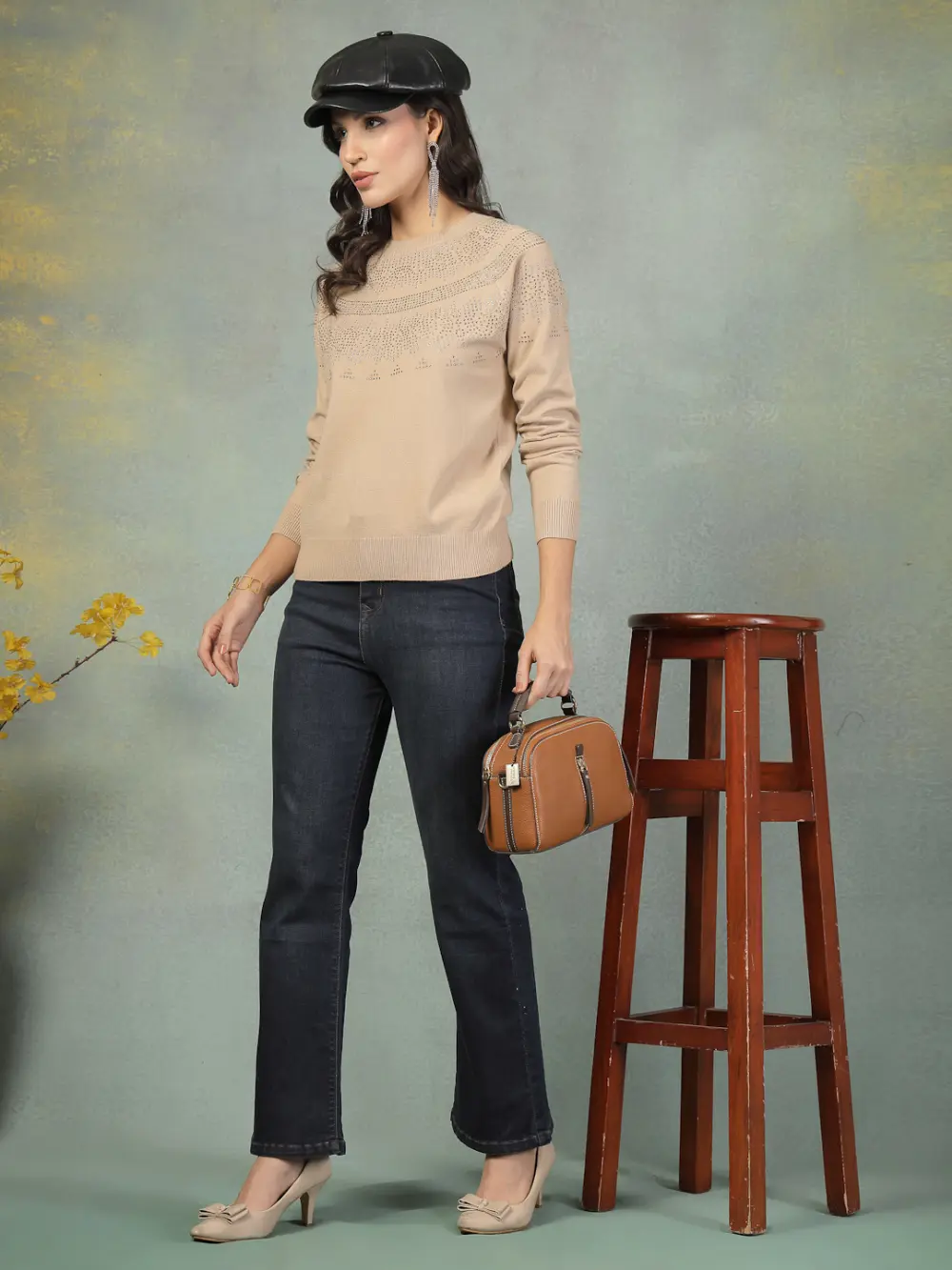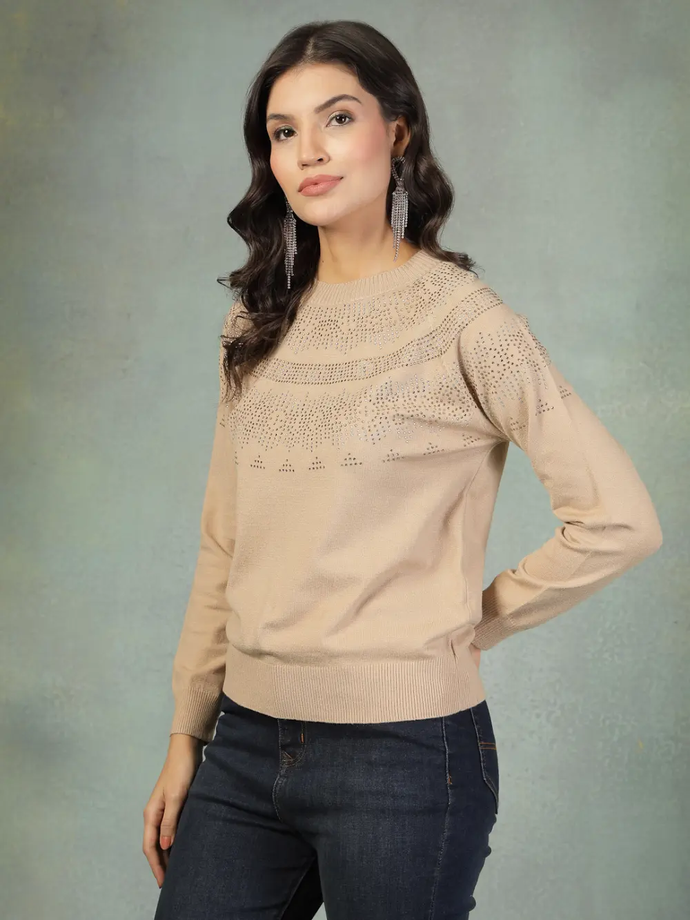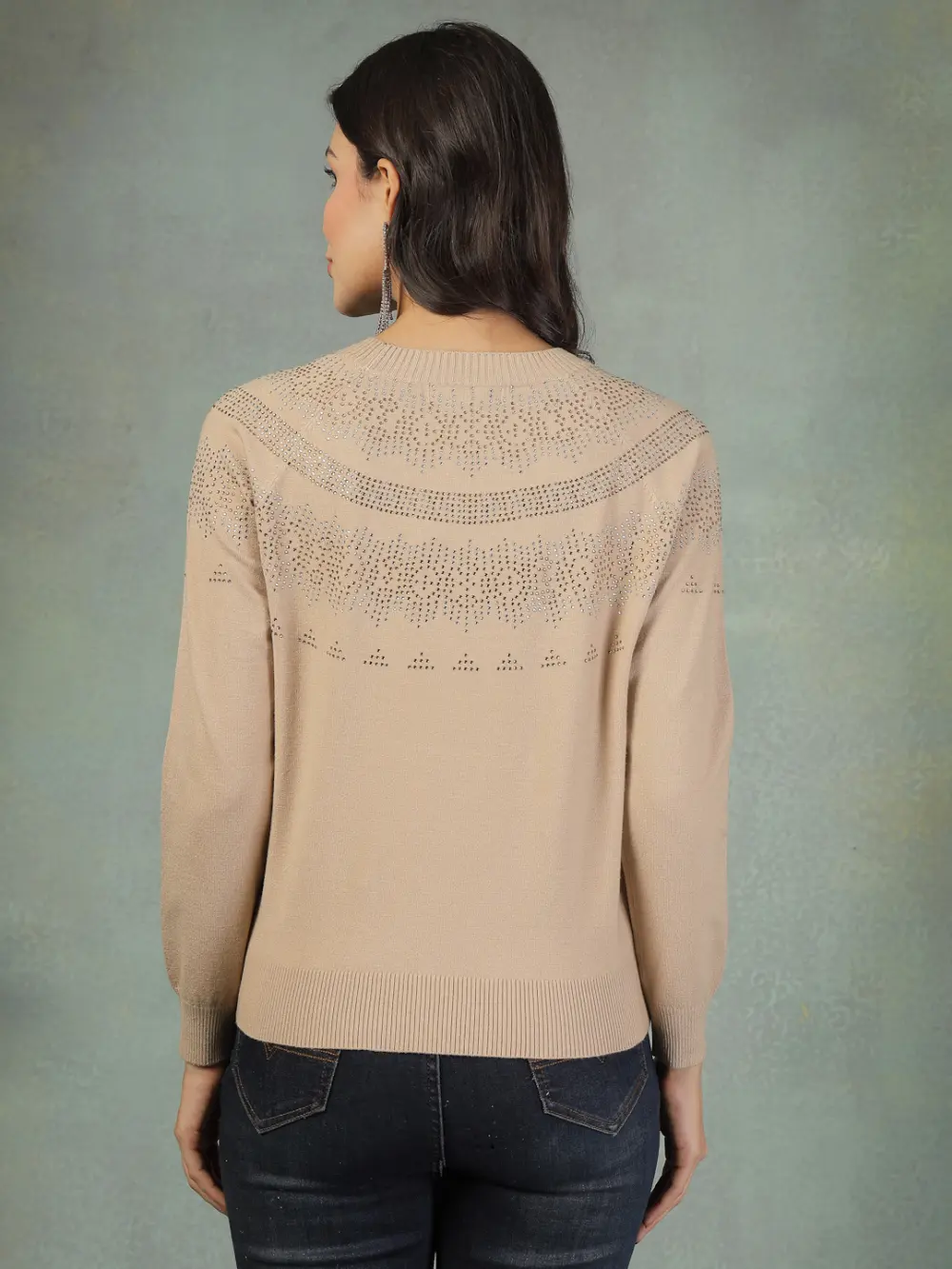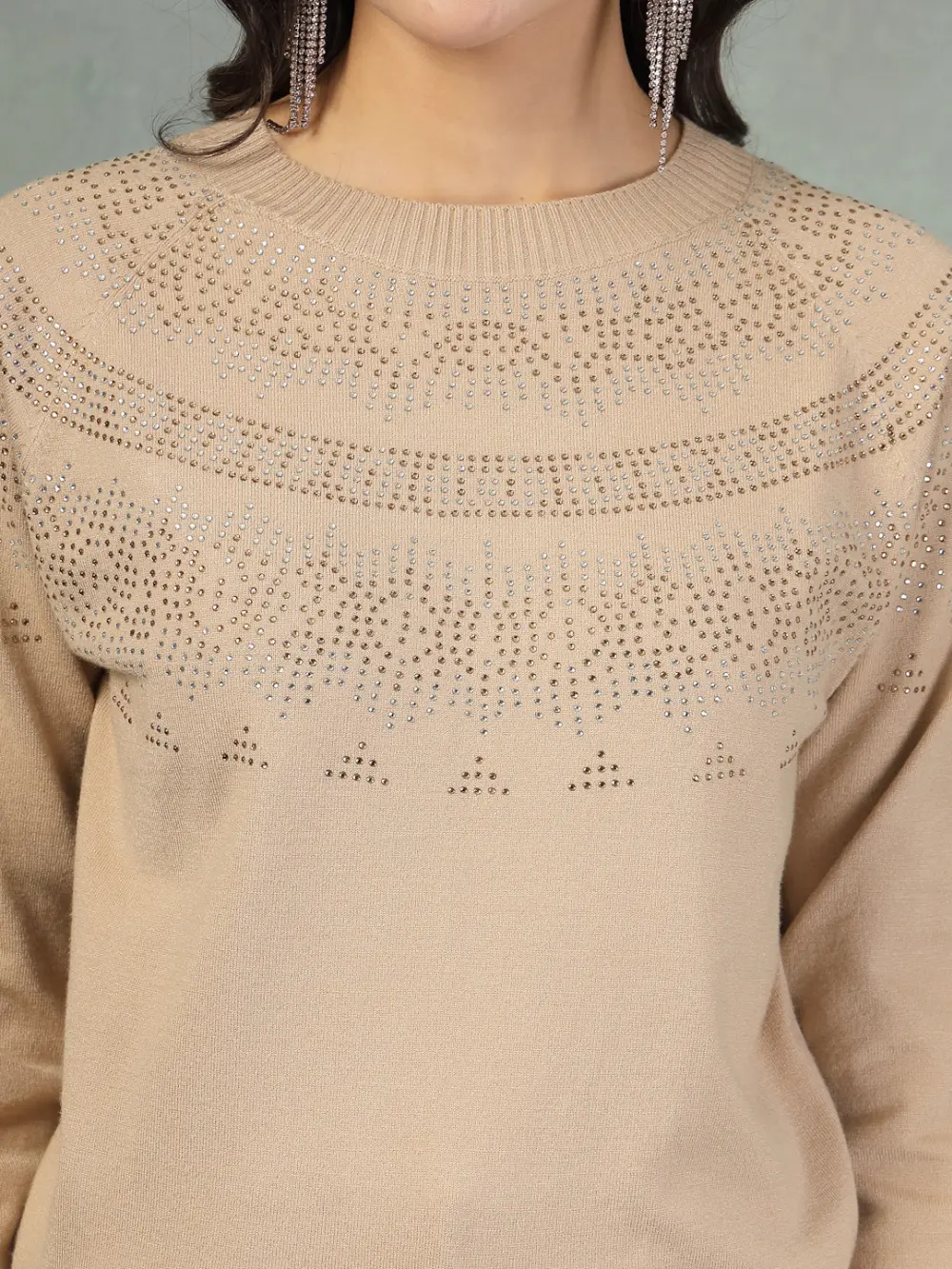 Khaki & gold-toned self design has embellished detail pullover ,has a round neck, long sleeves, ribbed hem