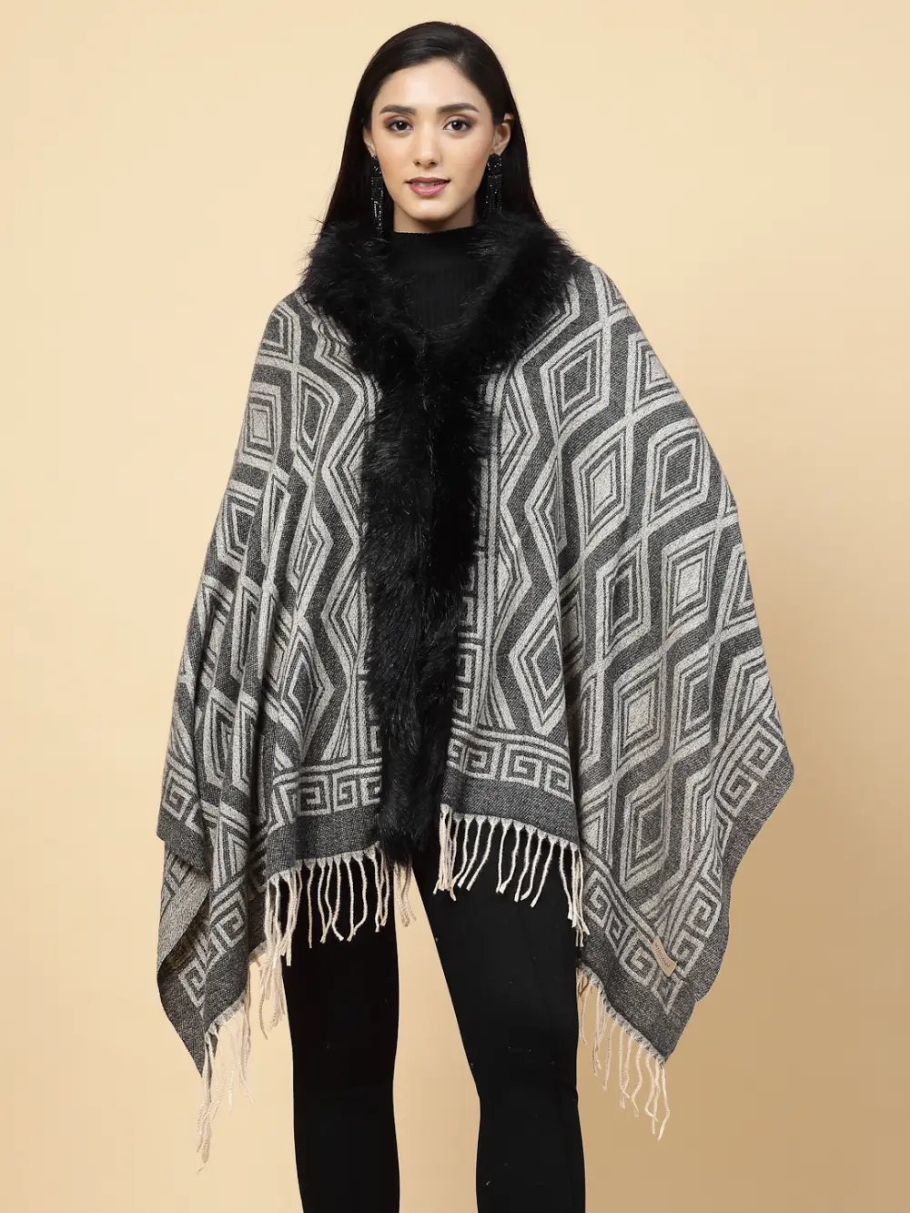 Grey printed poncho ,has a v-neck, long sleeves, fringed hem