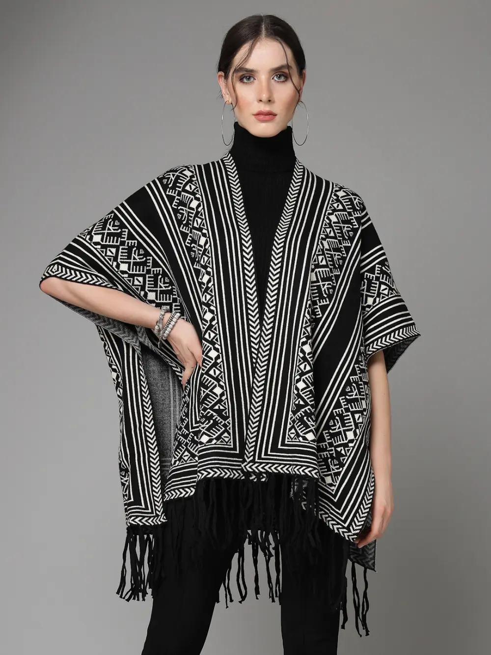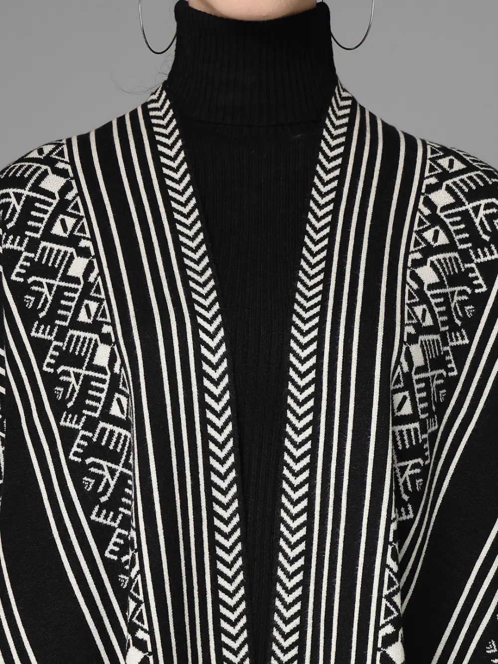 Black & white geometric printed poncho ,has a shawl collar, no pockets, short sleeves, ribbed hem