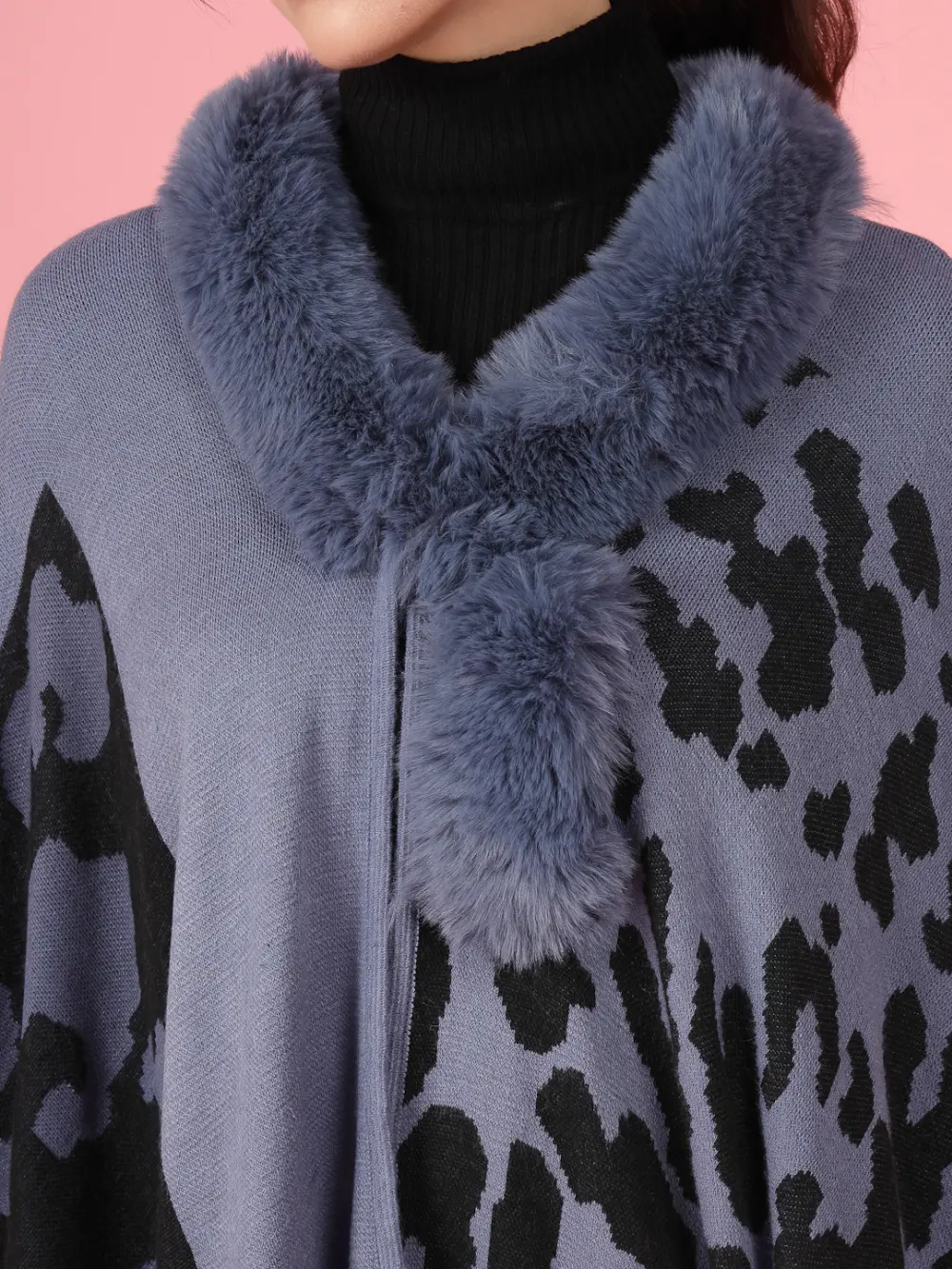 Blue and beige geometric printed poncho ,has a v-neck, long sleeves, asymmetric hem