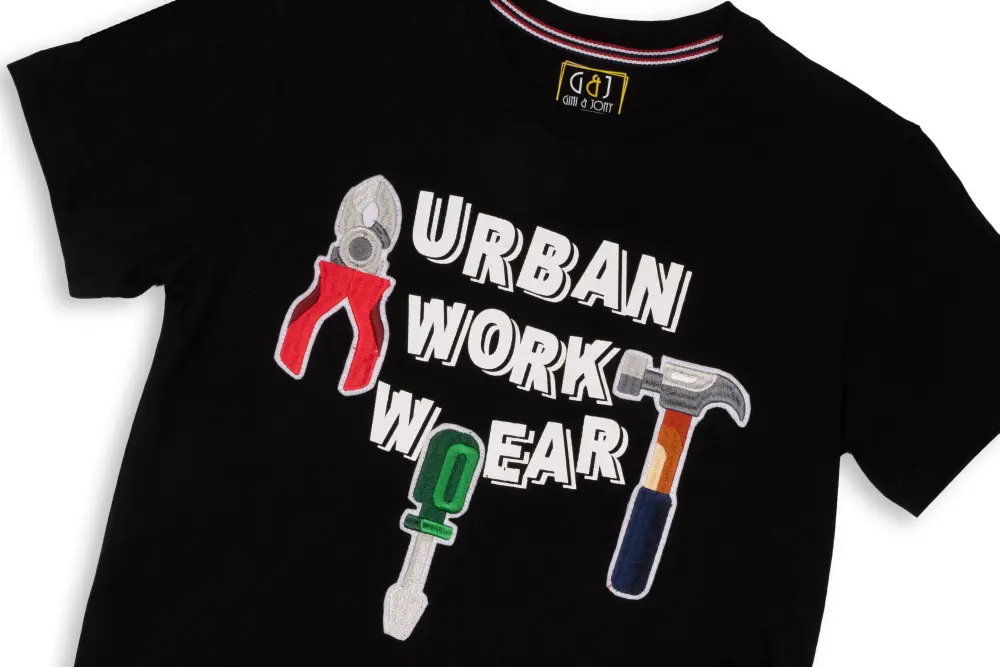 Gini and Jony makes a bold statement with this Boys’ Black Graphic Print T-Shirt. This tee features classic Half Sleeves, a comfortable Crew Neck, and a unique “Urban Work Wear” slogan graphic with detailed tool patches. Designed for a non-distressed Regular Fit, it features a simple Pull-On closure.