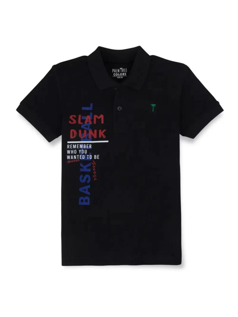 Make a statement with this black polo t-shirt from Gini & Jony featuring a striking typography print. The half sleeves, regular fit, and button closure make it a comfortable and stylish choice. The basketball theme print on the front adds a sporty flair, making it a perfect addition to your boy’s wardrobe. No additional colors keep it sleek and versatile.
