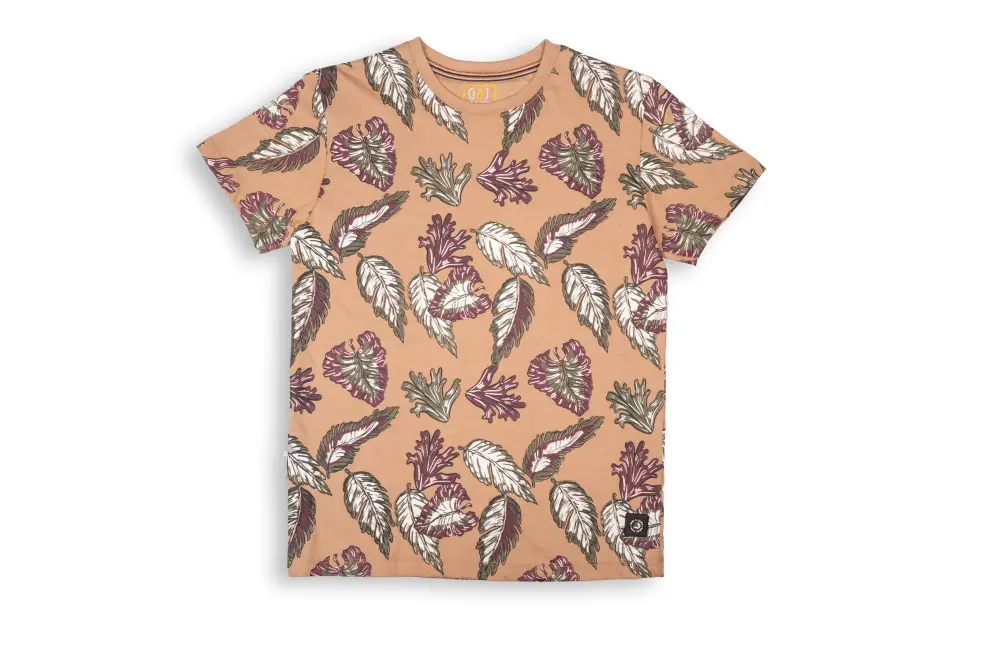 Gini and Jony brown T-shirt features a vibrant tropical all-over print in White, Green, and Maroon. This half-sleeved, regular-fit top has a classic Round Neck and simple Pull-On closure, perfect for creating a bold, vacation-ready look.