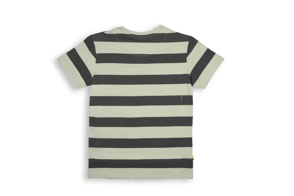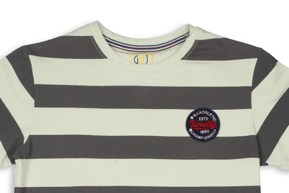 Gini and Jony green striped T-shirt is a vibrant piece with crisp black horizontal stripes. This half-sleeved, regular-fit top features a classic Round Neck and a simple Pull-On closure, ensuring easy wear and a stylish, versatile addition to his collection.