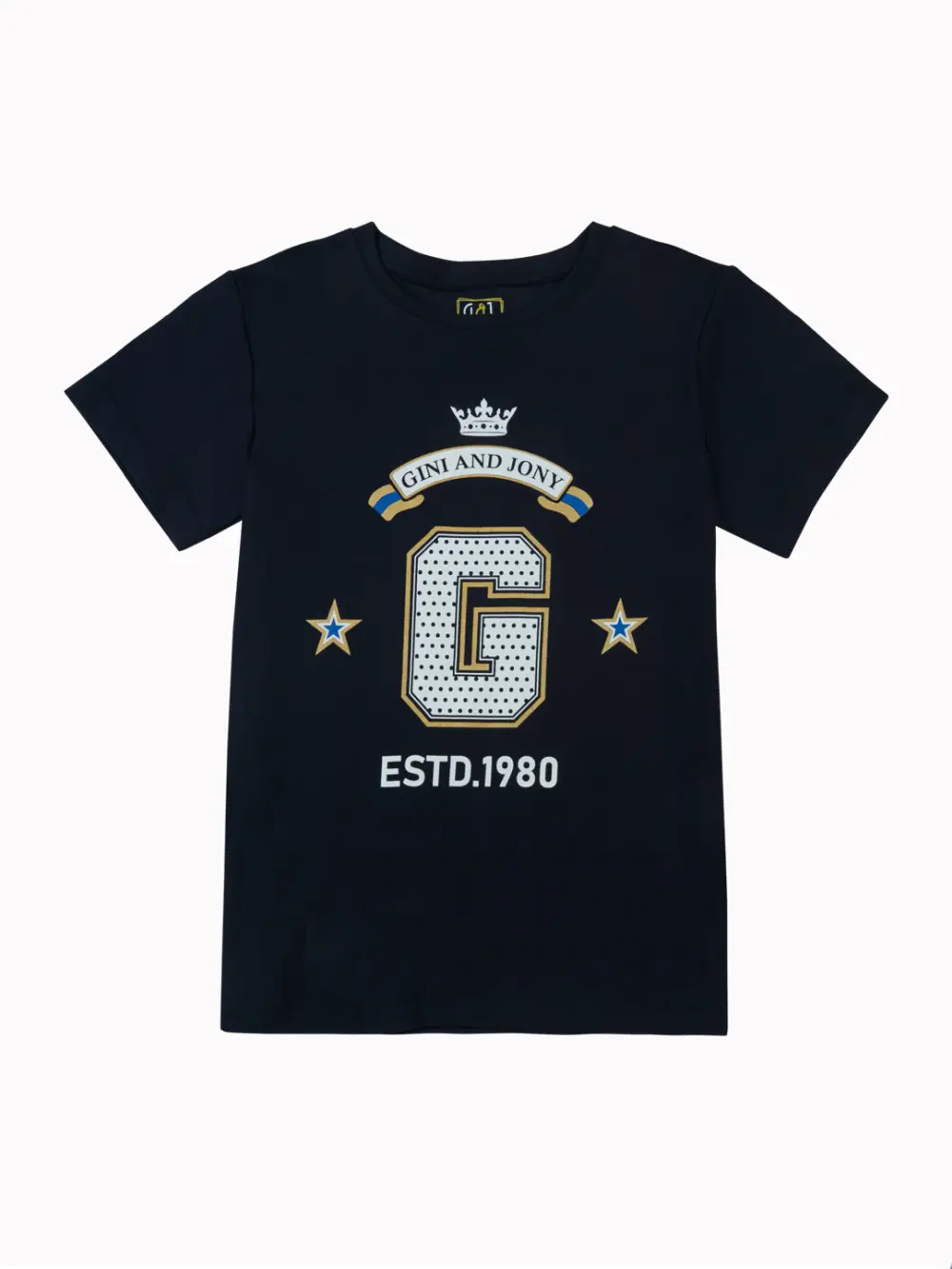 Gini and Jony navy blue T-shirt is a must-have casual piece. This half-sleeved, regular-fit top has a classic Round Neck and easy Pull-On closure. It features a striking graphic print that adds a cool, youthful edge, making it a stylish addition to their everyday rotation.