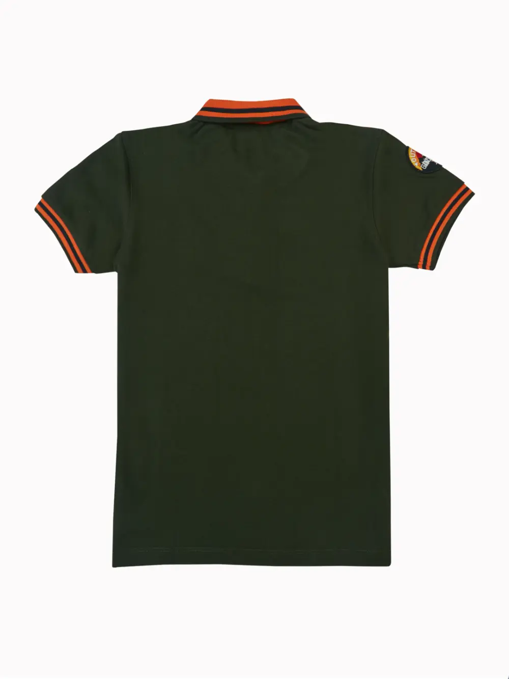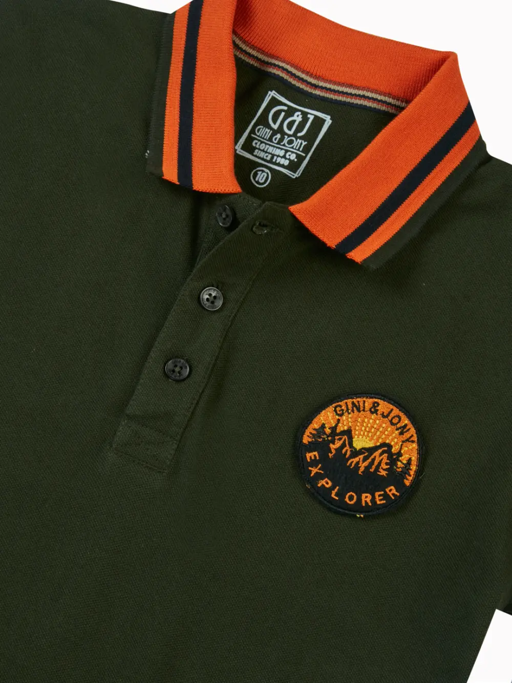 Gini and Jony Boys Olive Patch Polo T-Shirt is a regular-fit polo with a classic button closure. This explore-ready dark olive green polo features a vibrant orange collar with black double tipping and matching striped cuffs, making it a stylish and versatile choice.