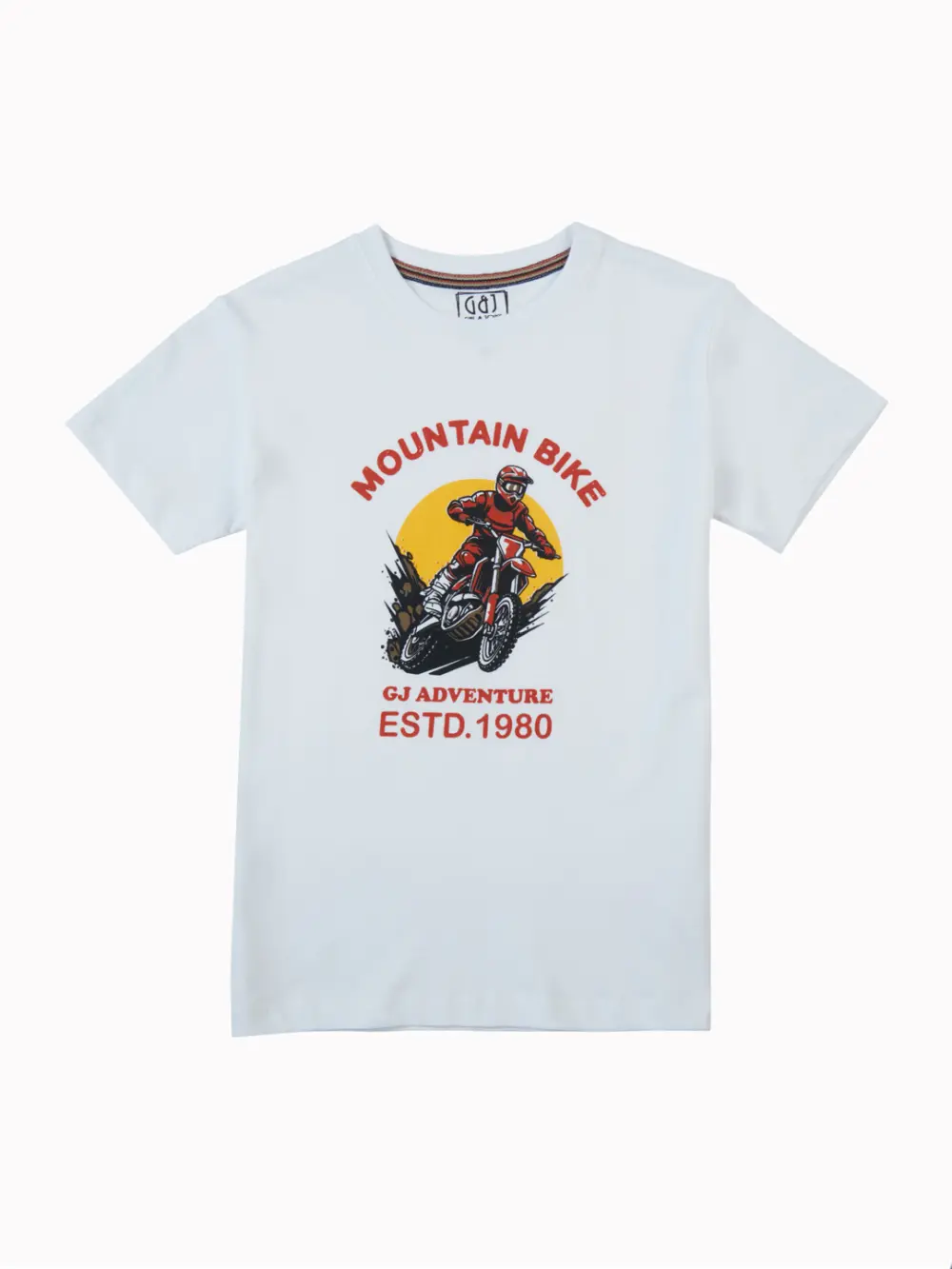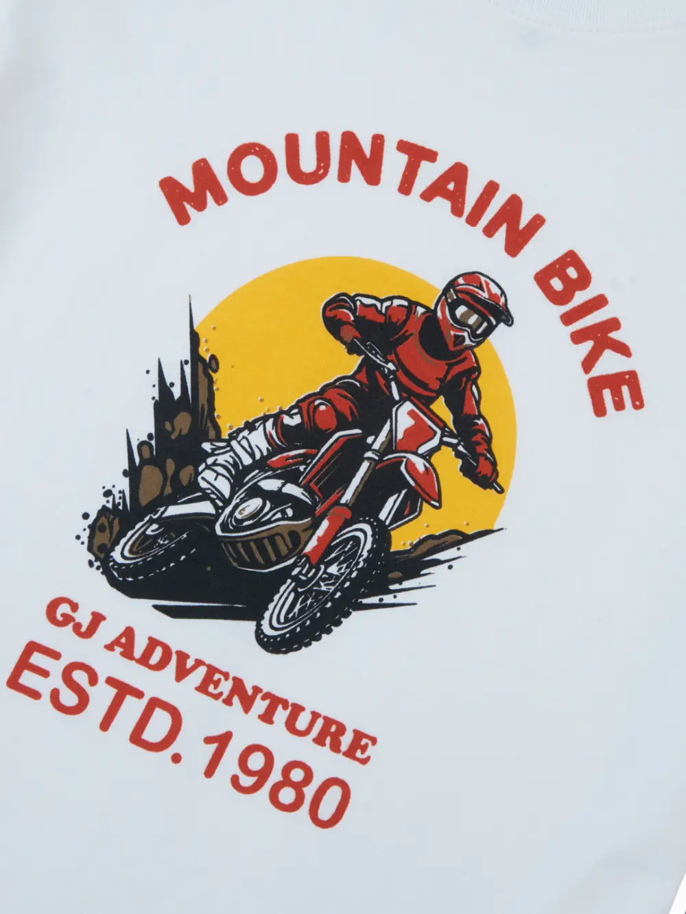 Gini and Jony Boys White Graphic Print T-Shirt is a regular-fit, half-sleeve tee with a round neck and a pull-on closure. This cool white tee features a bold, vintage-inspired motorcycle graphic and curved lettering in an earthy red and yellow palette.