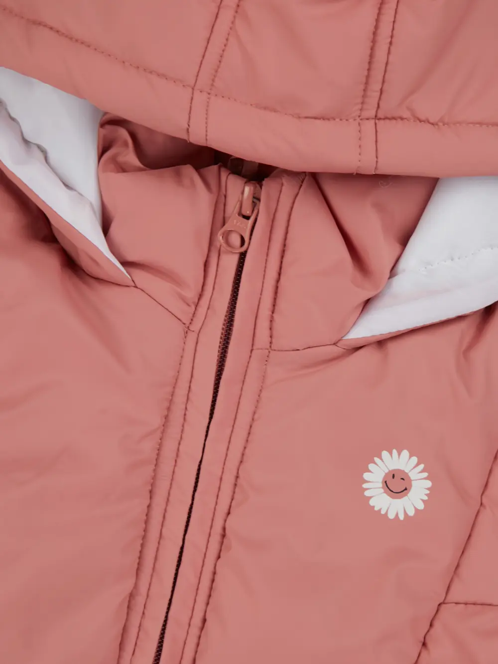 Girls Peach Typographic Print Taffeta Heavy Winter Jacket Sleeveless