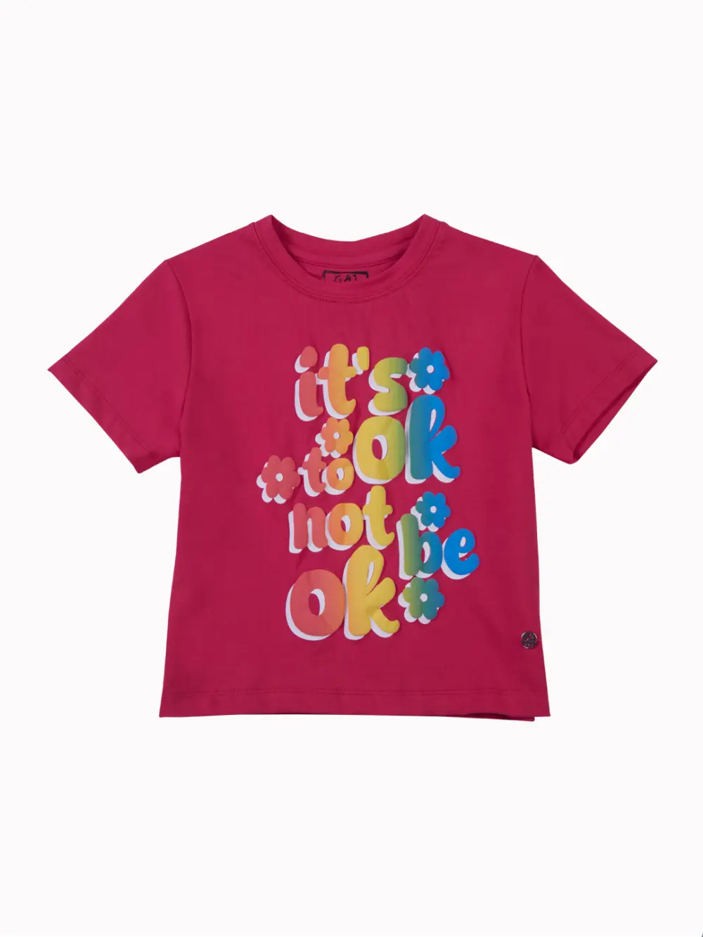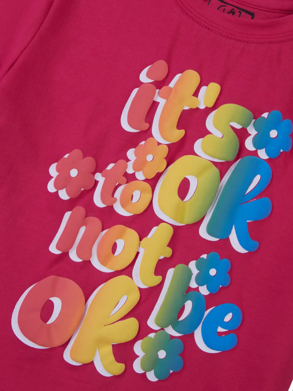 Gini and Jony Girls Pink Typography Knits Top is a regular-fit, half-sleeve top with a round neck and a pull-on closure. This striking fuchsia pink top features a dimensional, multi-colored puff print that reads, “It’s OK not to be OK,” making it a comfortable and expressive statement piece.