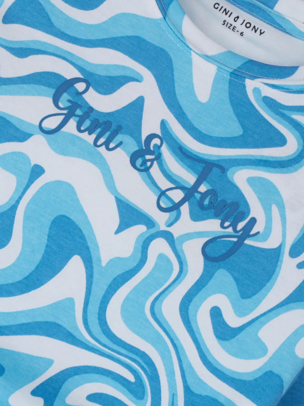 Girls Blue Printed Cotton Full Sleeves Knits Top