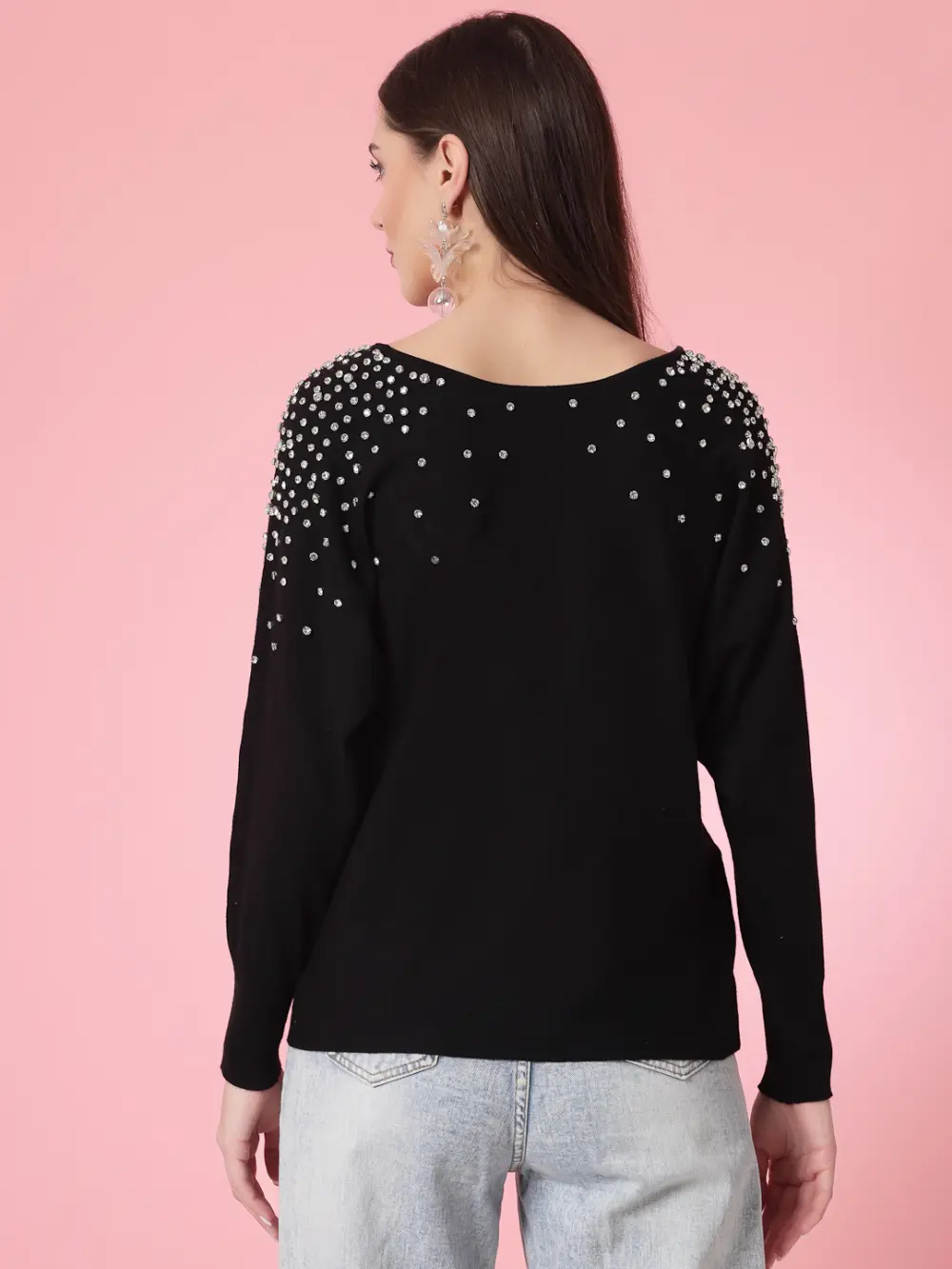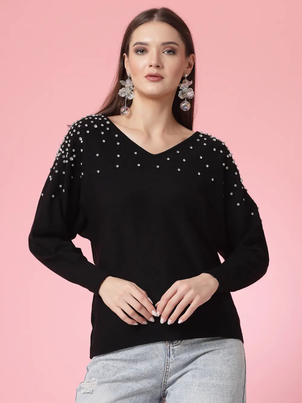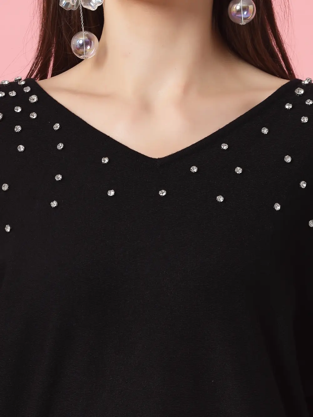 Black solid embellished pullover ,has a v-neck, long sleeves, ribbed hem