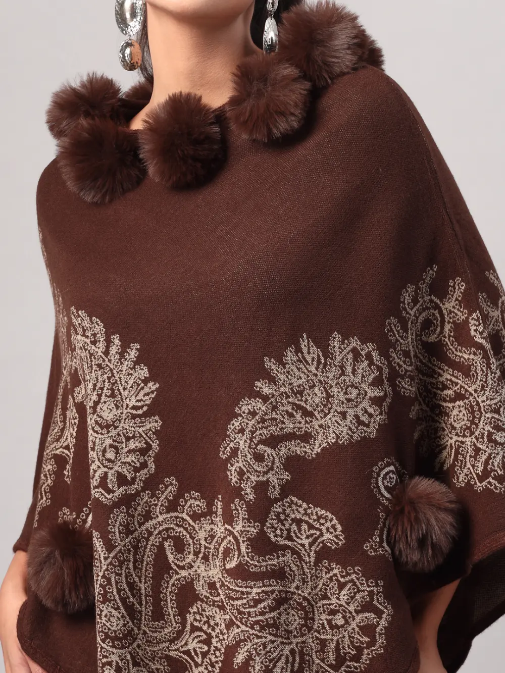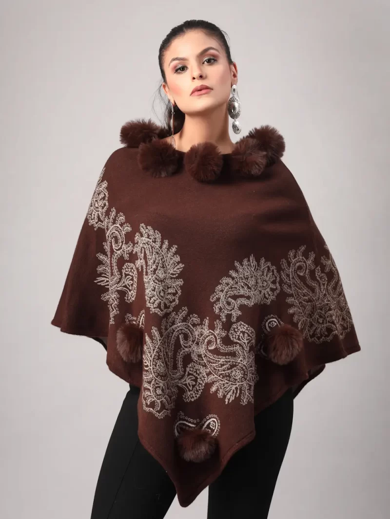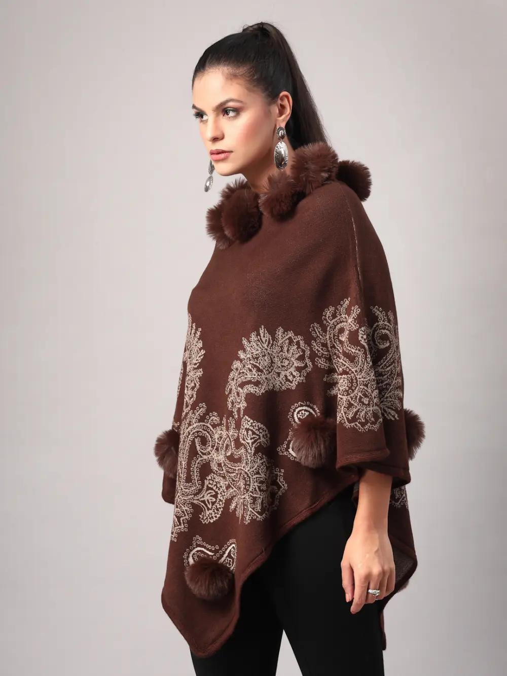Stay warm and stylish with this elegant brown poncho for women featuring intricate embroidery and playful fur pom-pom accents. The soft fabric and flowy design make it perfect for layering over casual or evening outfits, adding both comfort and charm. Ideal for winter outings, this poncho brings together fashion and coziness.