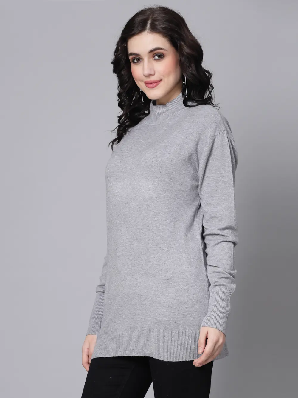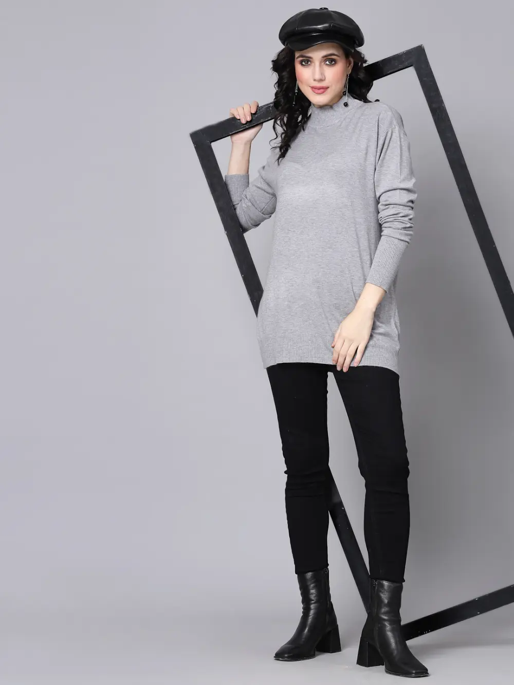 Grey solid pullover ,has a ,mock neck, long sleeves, ribbed hem