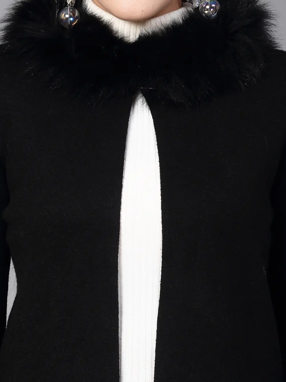 Black solid open front regular shrug ,has long sleeves, straight hem