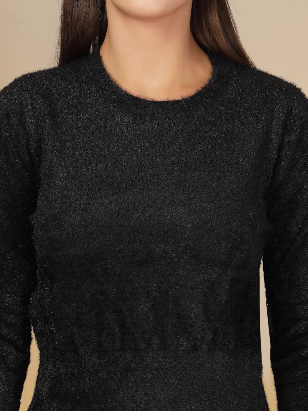 Black self design pullover ,has a round neck, long sleeves, ribbed hem