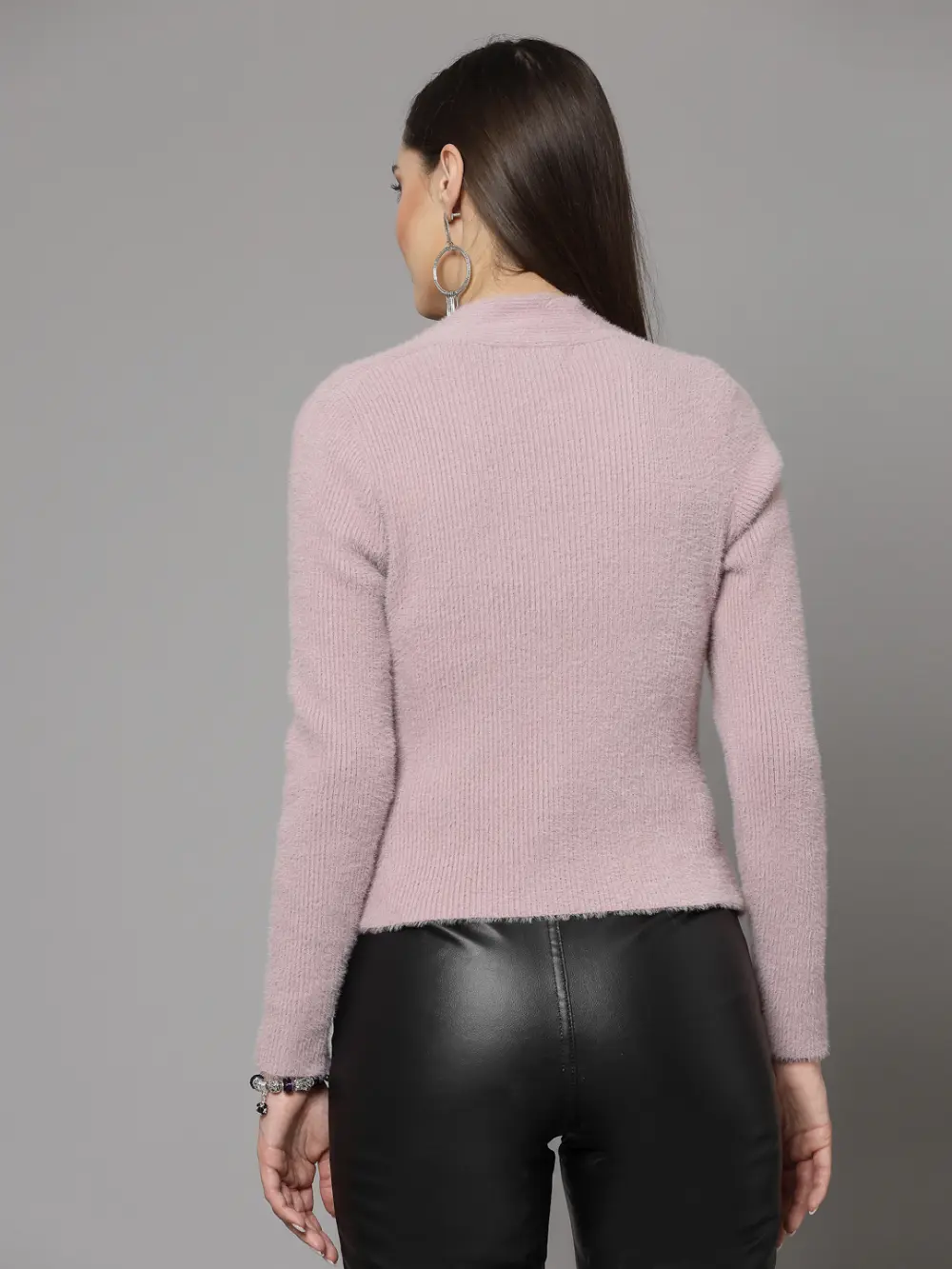 Peach-coloured ribbed pullover ,has a square neck, long sleeves, ribbed hem