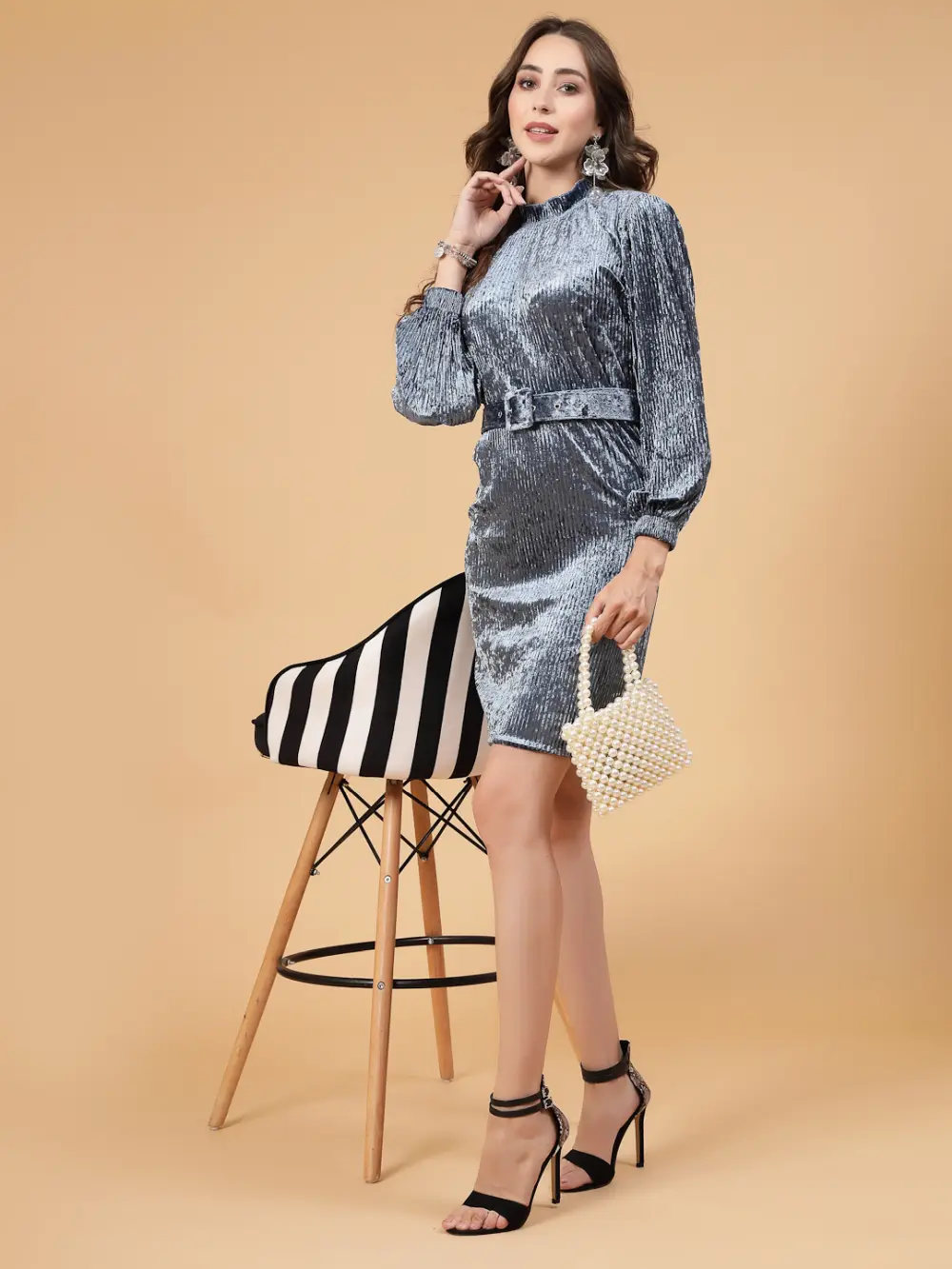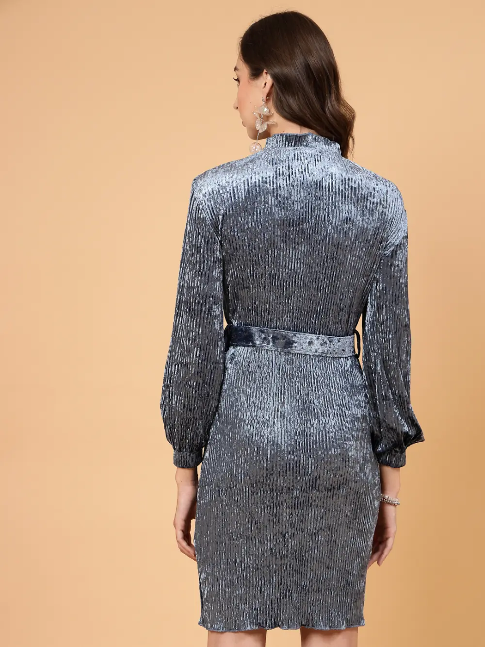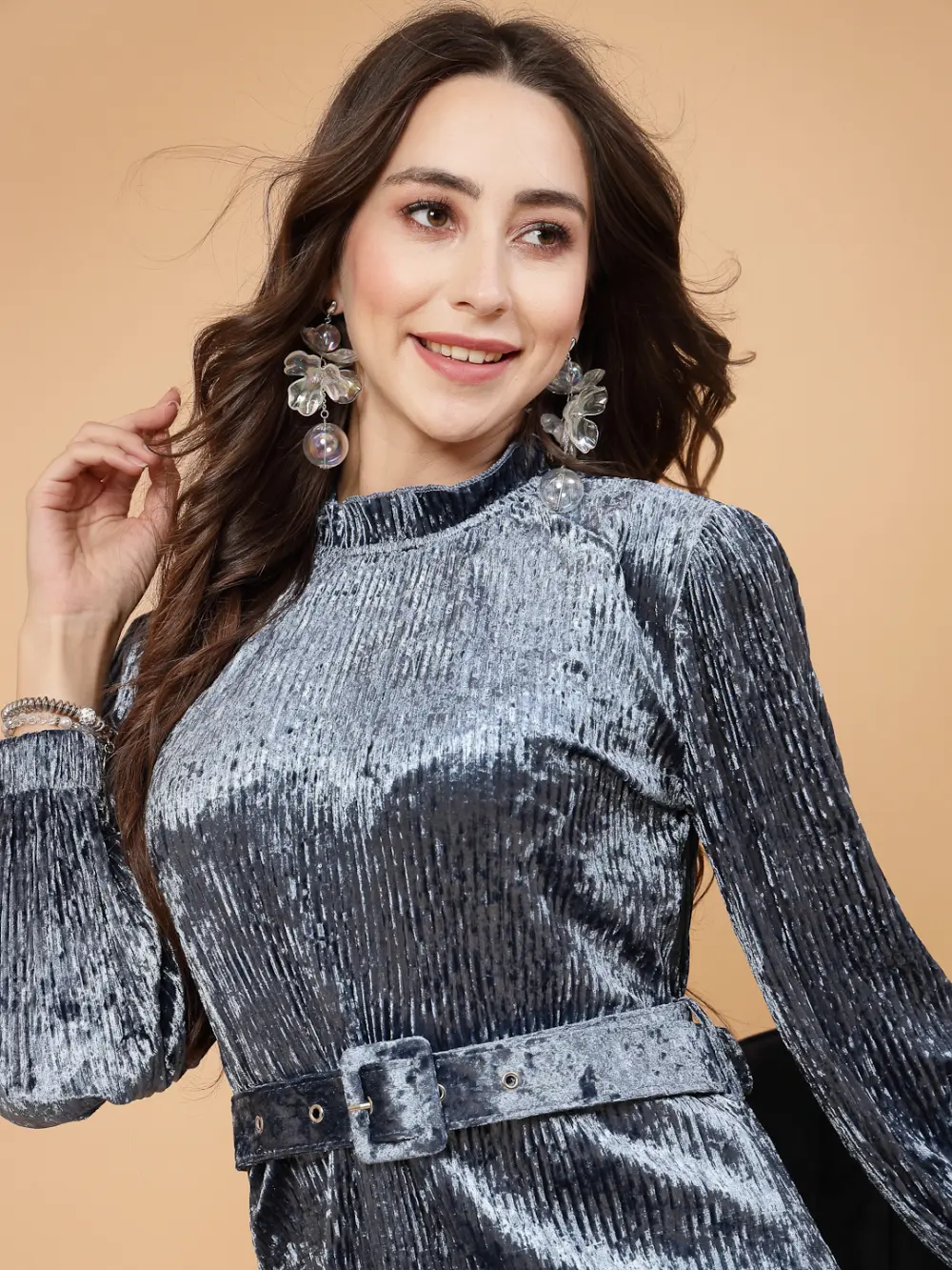 A stylish Blue velvet dress with a matching belt and full sleeves. Perfect for parties or evening outings.