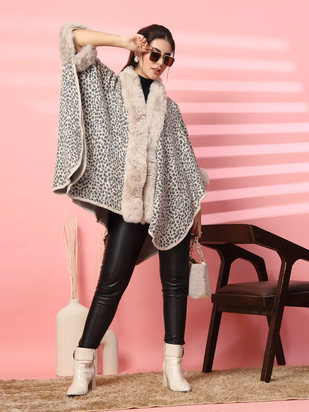 Beige printed poncho ,has a v-neck, long sleeves, asymmetric hem