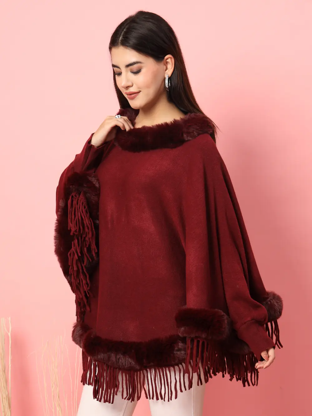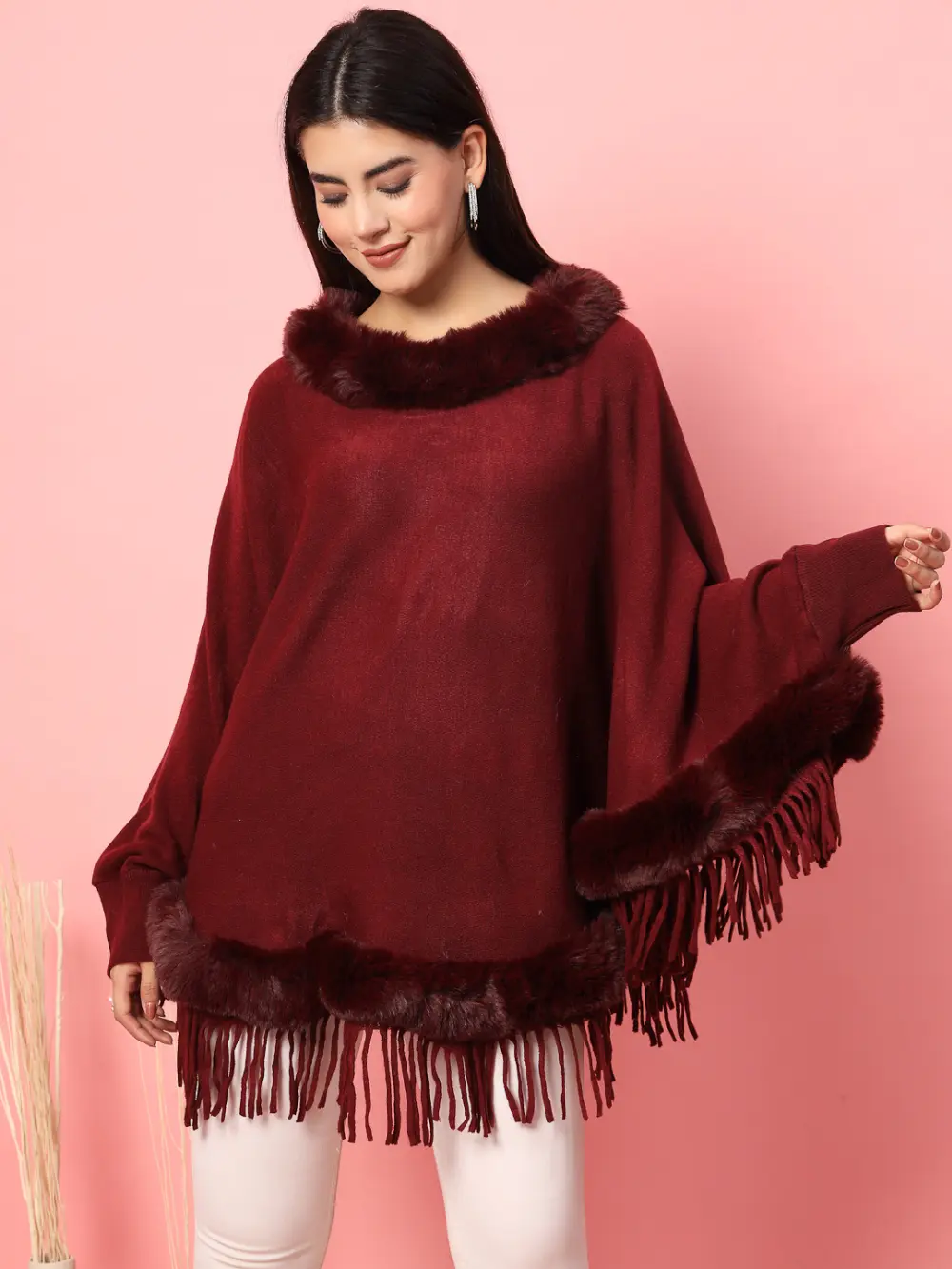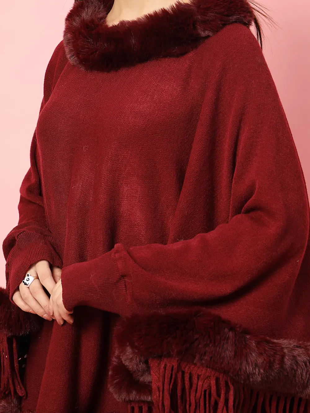 Maroon solid poncho ,has a round neck, long sleeves, ribbed hem