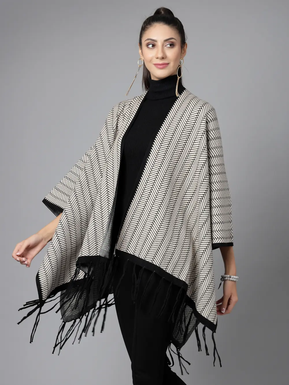 Grey printed fringed poncho ,has a lapel collar, long sleeves, fringed hem