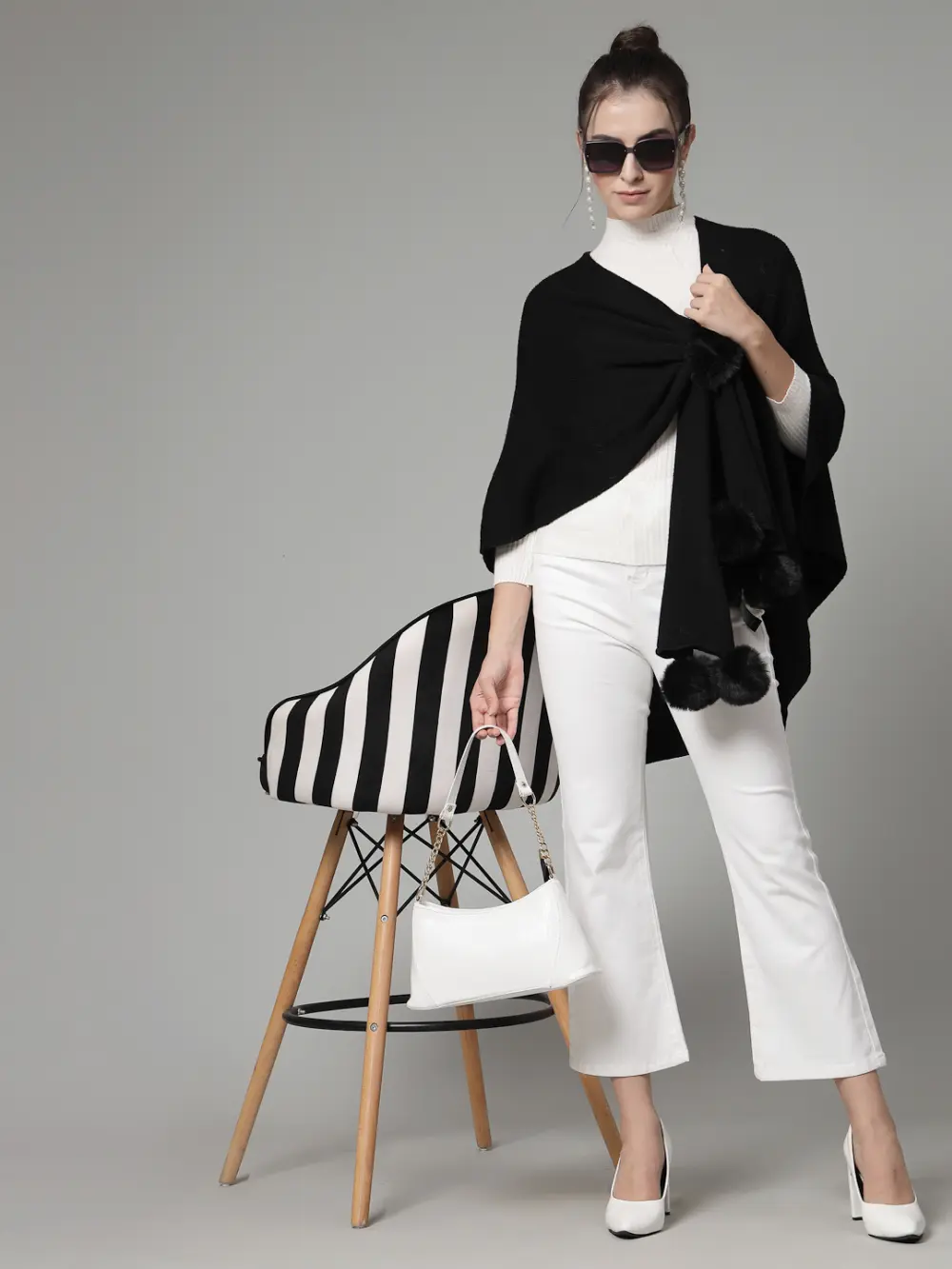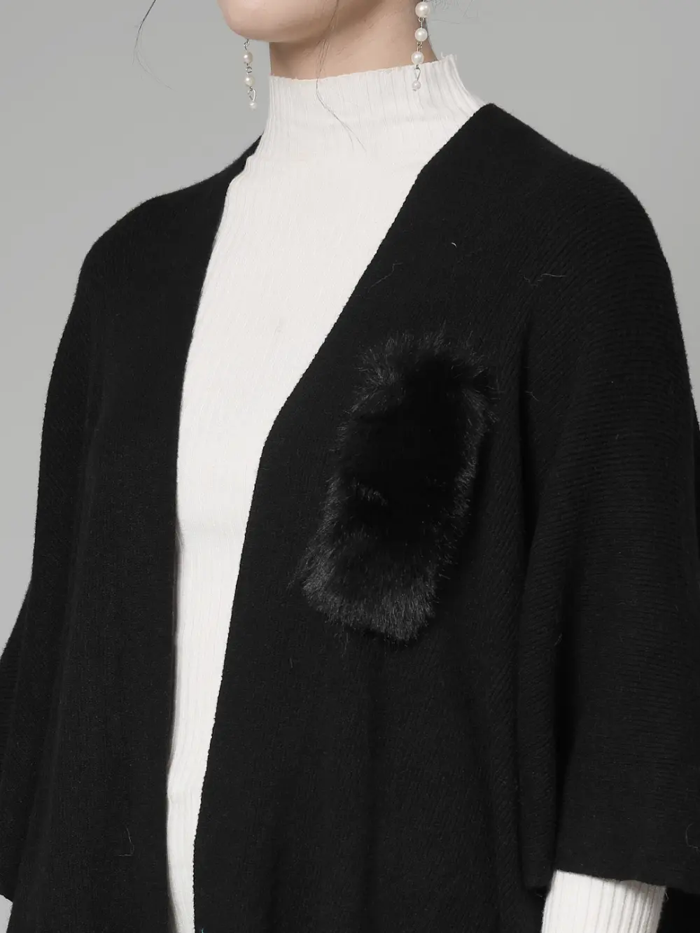 Black solid front-open Poncho, has a V-neck, long sleeves, asymmetric hem