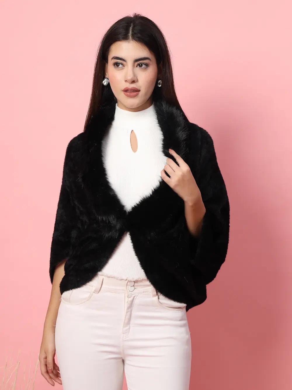 Black solid poncho ,has a v-neck, three-quarter sleeves, curved hem