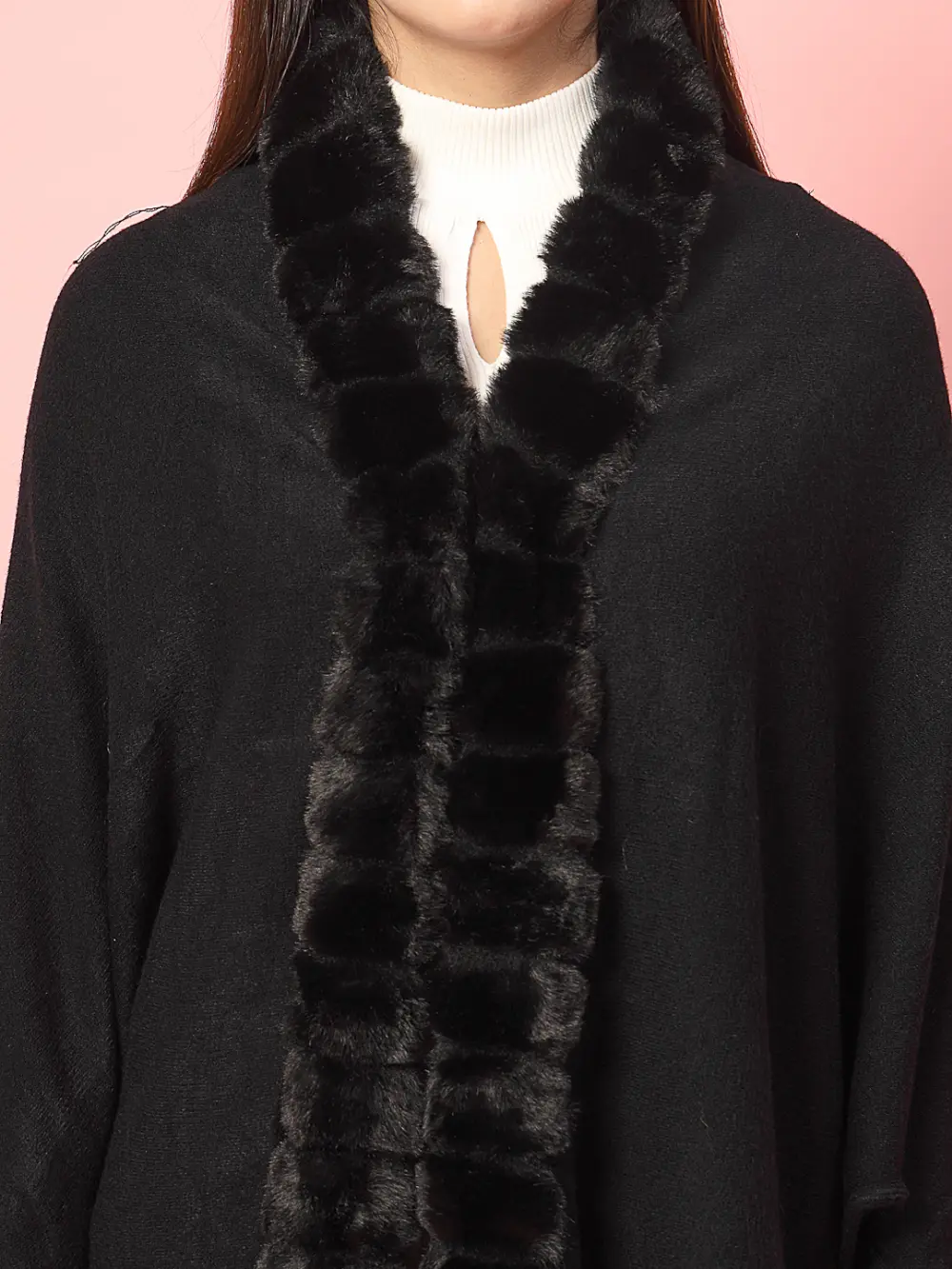 Black solid poncho ,has a v-neck,long sleeves, fringed hem