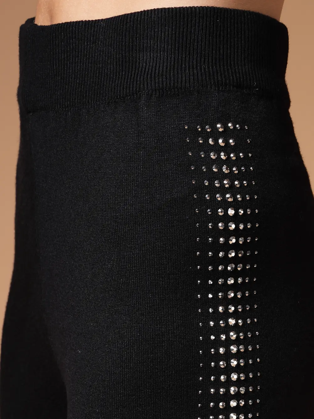 Black solid trousers with side panel embellished details, has regular waist hem & slip-on closure